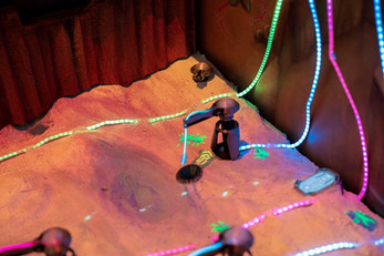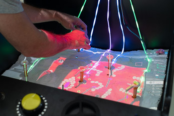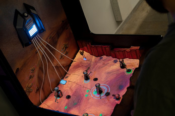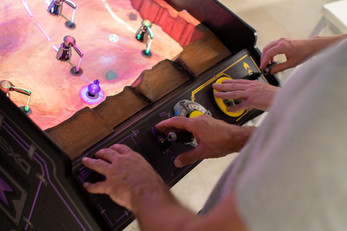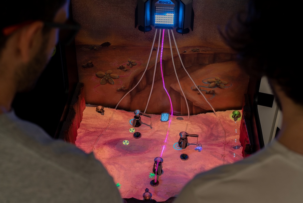 Proyecto EXO is an electromechanical game that blends a physical cabinet with a projected alien world where two players control rovers, cranes, and turrets. Move across a handcrafted terrain, defend extraction rigs from hostile creatures, and channel energy to your ship. A vivid fusion of digital projection, motorized machines, and fast co-op action.